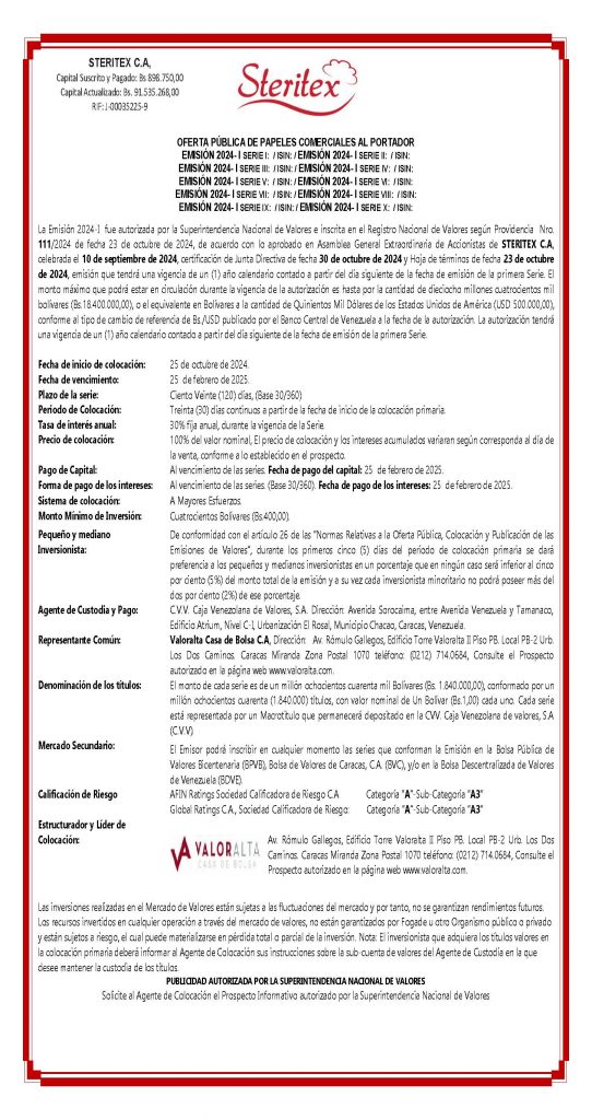 Los títulos que se colocaran son los correspondientes a las Series I, II, III, IV, V, VI, VII, VIII, IX y X de la Emisión 2024-I, de Papeles Comerciales al Portador, emitidos por la Empresa Emisora STERITEX, C.A.