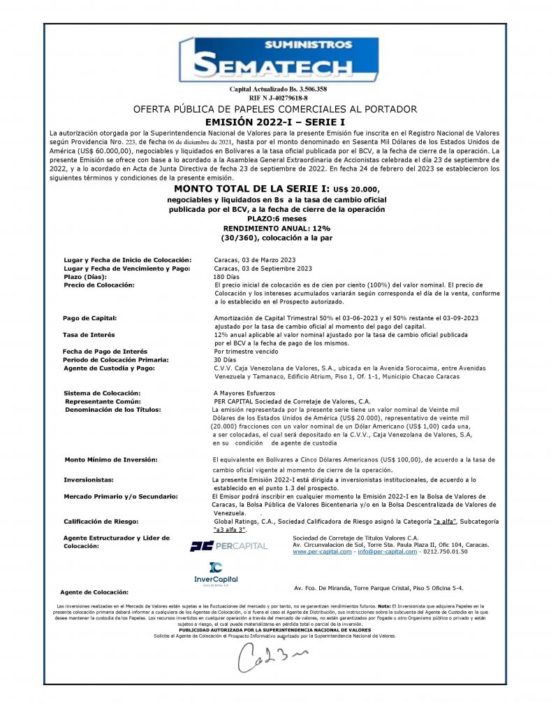 | Emisor | SUMINISTROS SEMATECH, C. A |