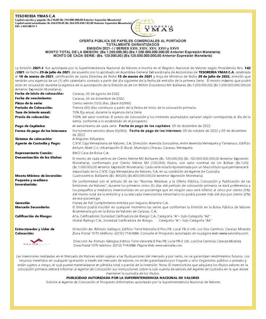 TESORERIA YMAS, C.A. EMISIÓN 2021-I