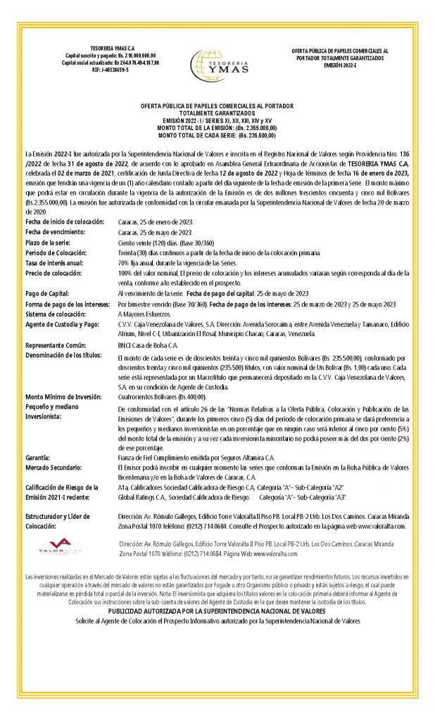 COLOCACION PRIMARIA DE PAPELES COMERCIALES AL PORTADOR EMISIÓN 2022-I SERIE XI MONTO Bs 235.500,00 EMISIÓN 2022-I SERIE XII MONTO Bs 235.500,00 EMISIÓN 2022-I SERIE XIII MONTO Bs 235.500,00 Y EMISIÓN 2022-I SERIE XV MONTO Bs 235.500,00