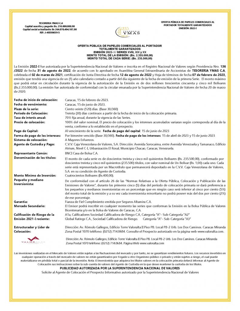 Los títulos que se colocaran son los correspondientes a las Series XVIII, XIX y XX, de la Emisión 2022-I, de Papeles Comerciales al Portador, emitidos por la Empresa EmisoraTESORERIA YMAS, C.A