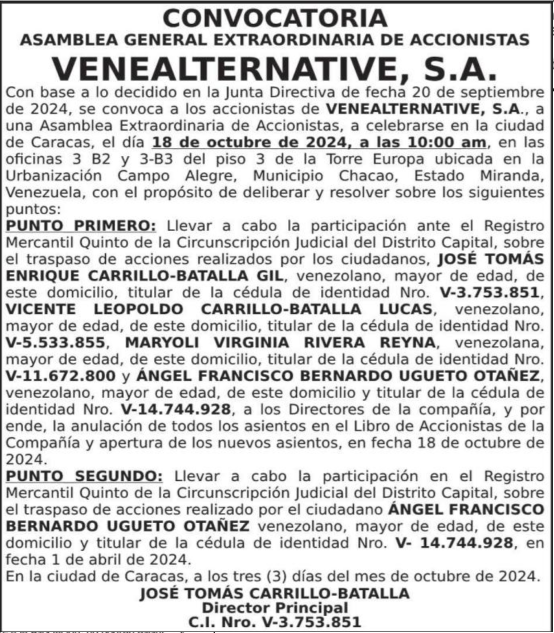 Con base a lo decidido en la Junta Directiva de fecha 20 de septiembre de 2024, se convoca a los accionistas de VENEALTERNATIVE, S.A., a una Asamblea Extraordinaria de Accionistas, a celebrarse en la ciudad de Caracas, el día 18 de octubre de 2024, a las 10:00 am, en las oficinas 3 B2 y 3-B3 del piso 3 de la Torre Europa ubicada en la Urbanización Campo Alegre, Municipio Chacao, Estado Miranda, Venezuela, con el propósito de deliberar y resolver sobre los siguientes puntos: