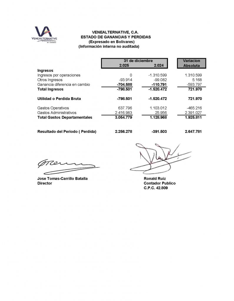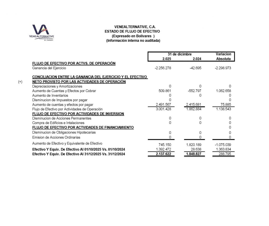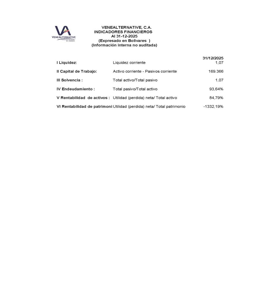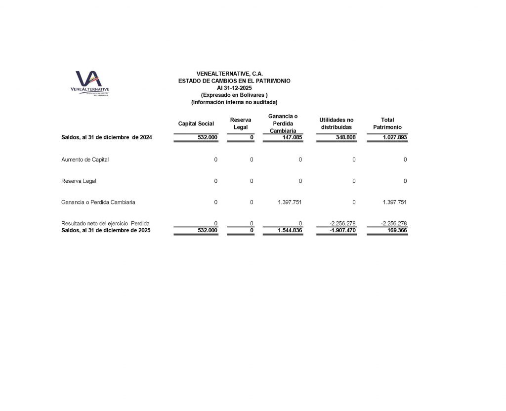 Estados de Situación Financiera, al 30 de diciembre de 2025-2024, Expresado en Bolívares . Estado de Resultados , finalizado el 31 de diciembre de 2025-2024, en bolívares, Estado de cambios en el Patrimonio, Estado de flujo de efectivo e Indicadores Financieros