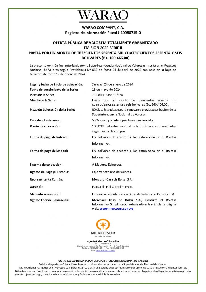 Los títulos para colocar son los correspondiente a la Serie II, de la Emisión 2023, de Valores de Emprendedores (VALOREM), de WARAO COMPANY, C.A, con denominación en bolívares.