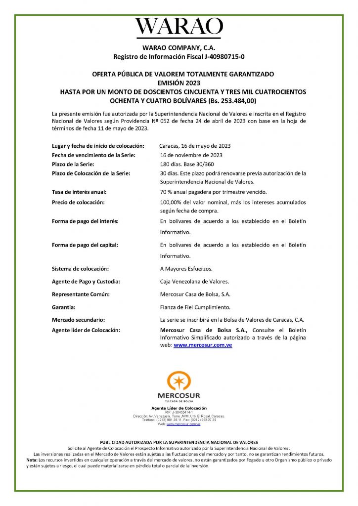 Los títulos para colocar son los correspondiente a la Serie 1, de la Emisión 2023, de Valores de Emprendedores (VALOREM), de WARAO COMPANY, C.A, con denominación en bolívares.