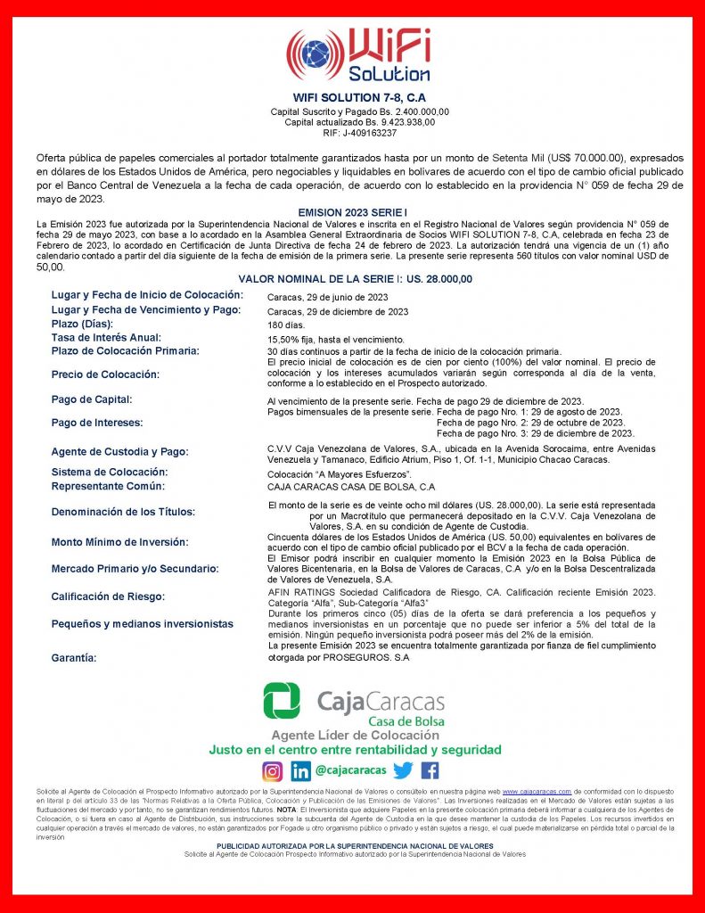Los títulos para colocar son los correspondiente a la Serie I, de la Emisión 2023, de Papeles Comerciales al Portador, emitidos por la Empresa Emisora WIFI SOLUTION 7-8, C. A., con denominación en dólares de los Estados Unidos de América (USD$). Negociable y Liquidables en Bolívares.
