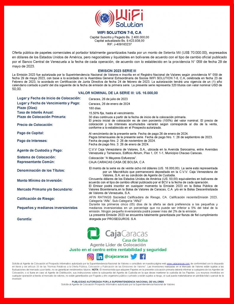 Los títulos para colocar son los correspondiente a la Serie III, de la Emisión 2023, de Papeles Comerciales al Portador, emitidos por la Empresa Emisora WIFI SOLUTION 7-8, C. A., con denominación en dólares de los Estados Unidos de América (USD$). Negociable y Liquidables en Bolívares.