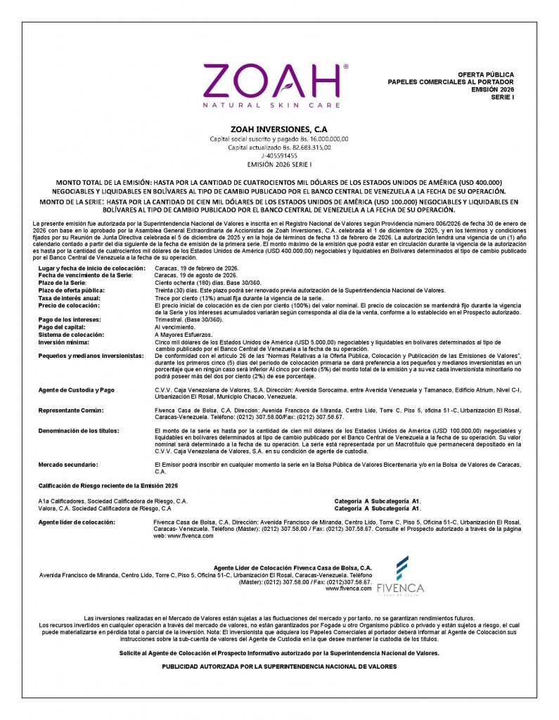 ZOAH INVERSIONES C.A., PAPELES COMERCIALES AL PORTADOR EMISIÓN 2026 (Nuevo Emisor)